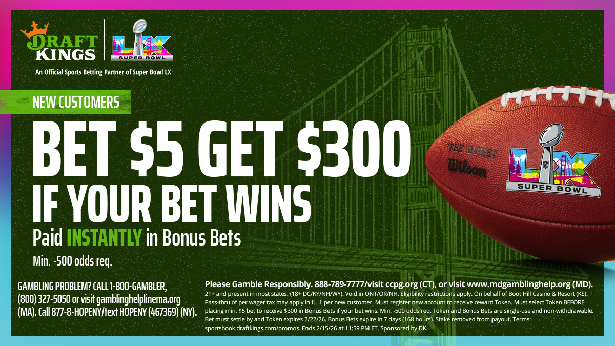 GAMBLING PROBLEM? CALL 1-800-GAMBLER, (800) 327-5050 or visit gamblinghelplinema.org (MA). Call 877-8-HOPENY/text HOPENY (467369) (NY). Please Gamble Responsibly. 888-789-7777/visit ccpg.org (CT), or visit www.mdgamblinghelp.org (MD). 21+ and present in most states. (18+ DC/KY/NH/WY). Void in ONT/OR/NH. Eligibility restrictions apply. On behalf of Boot Hill Casino & Resort (KS). Pass-thru of per wager tax may apply in IL. 1 per new customer. Must register new account to receive reward Token. Must select Token BEFORE placing min. $5 bet to receive $300 in Bonus Bets if your bet wins. Min. -500 odds req. Token and Bonus Bets are single-use and non-withdrawable. Bet must settle by and Token expires 2/22/26. Bonus Bets expire in 7 days (168 hours). Stake removed from payout. Terms: sportsbook.draftkings.com/promos. Ends 2/15/26 at 11:59 PM ET. Sponsored by DK.