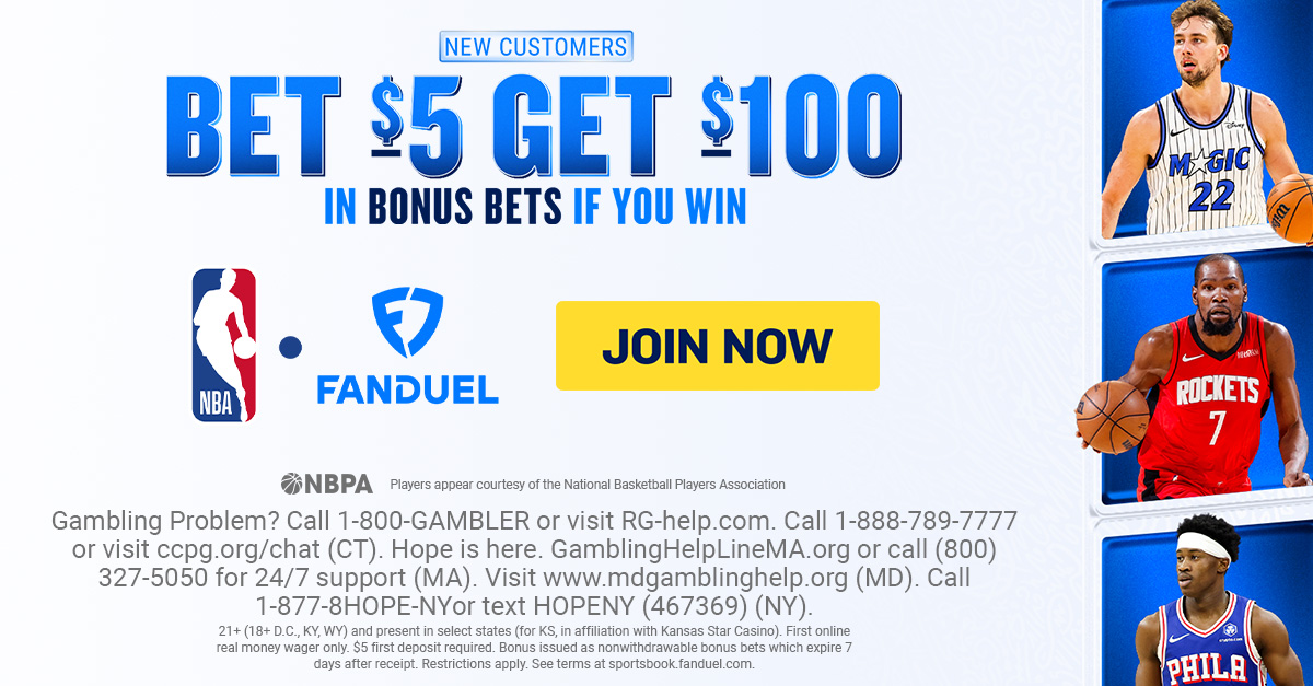 Must be present in select states (for KS, in affiliation with Kansas Star Casino). First online real money wager only. $5 first deposit required. Bonus issued as nonwithdrawable bonus bets which expire 7 days after receipt. Restrictions apply. See terms at sportsbook.fanduel.com.