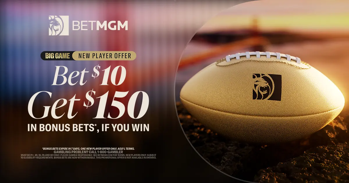 The promotional offer is for new customers only. Subject to eligibility requirements. Bonus bets are non-withdrawable. Must be physically located in CO, MI, NJ, PA, WV only. Void where prohibited. See BetMGM.com for Terms. US promotional offers not available in Mississippi, Nevada, New York, Ontario And Puerto Rico. Please Gamble Responsibly. Visit www.1800GAMBLER.net (WV). Ends 6/2/2025 at 12PM ETResponsibly. Visit www.1800GAMBLER.net (WV). Ends 4/8/2025 at 12PM ET. Data & text rates may apply.